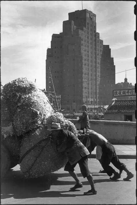 离开北平后,布列松一直在上海,南京,杭州一带活动,并一度打着白旗,步行试图前往山东前线作采访。在南京,他见证了政权的更替。▲南京,长期作为国民党的首都,仍然有着老城墙,而且比任何其他中国城市的城墙都还要古老。它们从很多朝代和太平天国运动中幸存下来。这里可以看见部分城墙,湖水反射出它们,明朝海军14世纪时在这个湖中操练。这些人在采集莲藕作为食物。▲1949年4月,南京解放前,国民党统治的最后日子里,来到南京的军阀马鸿逵。在马鸿逵照片的说明文字里,布列松写道:“马鸿逵的秘书打扮得像个护士。他喜欢吃冰激淋,身边随时都准备着几桶,只要有客人就请客人吃。”▲1949年4月,南京,带着家庭的财产外出逃亡的军官,背景是数千内战难民的临时住处布列松拍下了第一个步行进入南京城的疲惫的解放军战士,紧随这名士兵走过来的不是另一名士兵,而是一个负重的年老挑夫(即本文封面图)。他也拍摄了整齐地坐在路边休息的部队,以及围观者面对他们时惊讶,兴奋又疑虑重重的表情。布列松在上海记录下了这座鱼龙混杂的城市在新中国建立前最后几个月的社会风貌,包括疯狂的挤兑风潮,激奋的游行队伍和遵守纪律的新式军队。最后,九月底,他在上海码头登上了开往香港的轮船。▲1948年12月-1949年1月,上海抢购黄金风潮,由于纸币贬值,国民党决定每人可以兑换40克黄金, 12月消息传出,数以千计的人们排队等待,有十人拥挤致死。▲1948年12月-1949年1月,上海,抢购黄金风潮▲1948年12月-1949年1月,上海,被包围的上海,苏州河的运输完全中断▲1948年12月-1949年1月,上海,等待离开城市的政府官员▲1948年12月-1949年1月,上海,穷人撕开码头上的棉包。很多人在内战的最后一个冬天饿死或冻死。▲1949年,上海。慈善机构的一群孩子等着分发大米。在那儿,他们接受教育并得到极少量的食物。这所学校是孙中山的遗孀宋庆龄女士建立的。在布列松亲笔撰写的很短的一段旅行回顾里,他对政权的任何一方都没有发表自己的看法。这些照片,让人感觉他是一个不偏不倚的记录者,对被摄者充满了尊重,而那只握住相机的手从未因为过分激动而颤抖。这难得的忠实还原,使得我们可以平心静气被带回那个时代,不偏左也不偏向右。▲1949年6月,上海,政治集会(解放军于5月27日夺取上海)▲1949年8月1日,上海,隆重举行欢庆部队开进上海的活动,一名工会代表拿着一张放大了的新钞纸币▲1949年,上海,学生举行反黑市的“8.1”胜利大游行,队伍经过外滩,背景是中国银行▲1949年8月7日,上海,在胜利庆典大会上讲话的陈毅▲1949年,上海,《升官发财》正在一家戏院上演,在这个场景中,蒋介石对他妻子的姐夫、金融家和前国民党政府财政部长孔祥熙大动肝火。这部戏在国民党还在掌权时就写好了,但共产党重写了该剧,加大了讽刺性。▲1949年,上海,标语上写着“反对官僚资本、封建主义、帝国主义”▲1949年,上海,一些解放军士兵对巨幅广告牌已经习以为常,但有些士兵则怀着惊奇的眼光▲1949年9月,上海,国民党政府撤离上海后,对上海实施海上封锁,经过5个月的封锁之后,一艘美国军舰“戈登”号抵达上海港,搭载外籍人士离开上海。布列松的作品清晰地展现了那段岁月人们生活的转变,再看几张1949年布列松在杭州和香港拍下的照片。▲1949年,香港,《华商报》号外, 两条消息:华南解放,政治协商会议准备起草新宪法▲1949年,香港,一个婴儿在商铺柜台上午睡,他的父亲则躺在凳子上休息1958年6月,布列松像很多新中国的“好同志”一样,再次被邀请到中国访问三个月。不知道这一次他的观感如何。他仍然拍摄了大量的照片,其中的一些作品,后来受到了中国方面的批判。不过他说:“安排出来的照片是没有生命力的,很容易被人们遗忘。如果你忠实于生活,你就能得到胜利。”